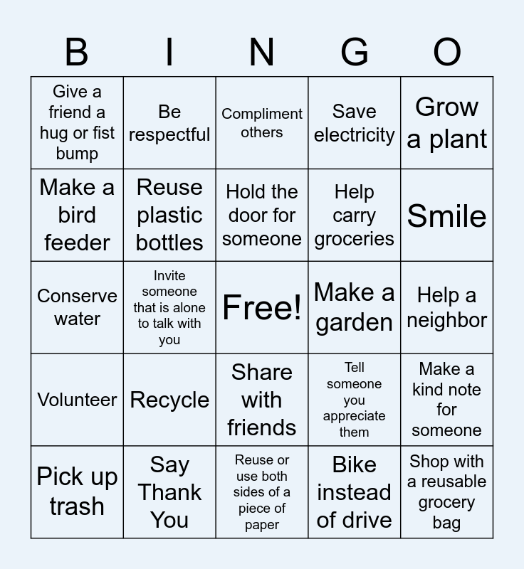 This bingo card has a free space and 24 words: Recycle, Say Thank You, Hold the door for someone, Pick up trash, Grow a plant, Give a friend a hug or fist bump, Make a bird feeder, Be respectful, Make a garden, Share with friends, Help carry groceries, Conserve water, Tell someone you appreciate them, Make a kind note for someone, Reuse plastic bottles, Bike instead of drive, Help a neighbor, Compliment others, Smile, Invite someone that is alone to talk with you, Shop with a reusable grocery bag, Volunteer, Save electricity and Reuse or use both sides of a piece of paper.