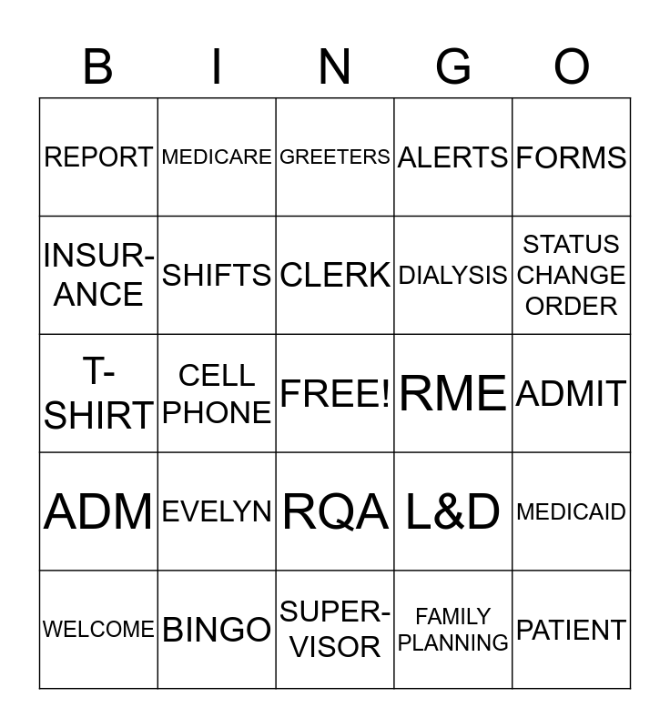 This bingo card has a free space and 24 words: EVELYN, BINGO, CLERK, WELCOME, FORMS, REPORT, INSUR-ANCE, MEDICARE, RME, RQA, DIALYSIS, T-SHIRT, L&D, MEDICAID, SHIFTS, FAMILY PLANNING, ADMIT, GREETERS, STATUS CHANGE ORDER, CELL PHONE, PATIENT, ADM, ALERTS and SUPER- VISOR.