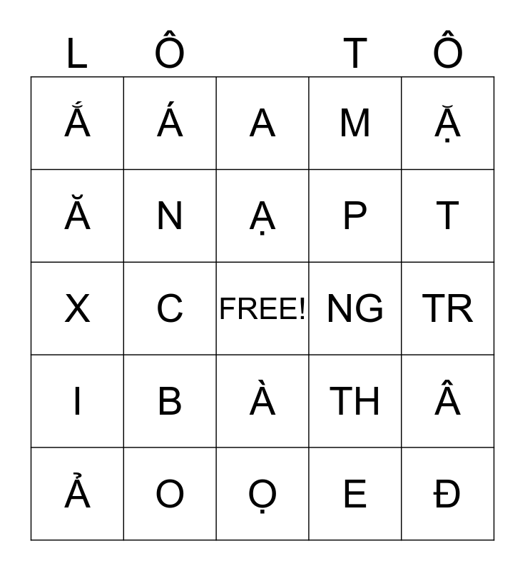 This bingo card has a free space and 24 words: B, O, Ạ, Ả, Ặ, Ắ, Ă, Á, NG, À, P, X, TH, Â, N, E, TR, A, T, C, Đ, I, M and Ọ.