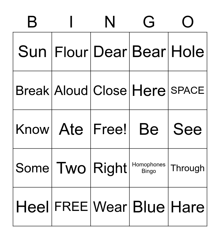This bingo card has a free space and 27 words: Homophones Bingo, Buy, Here, Wear, Break, Dear, Flour, Some, Be, Through, Know, Bear, Heel, FREE, SPACE, Read, Aloud, Close, Two, Sun, See, Blue, Ate, Hare, Right, Hole and Hi.