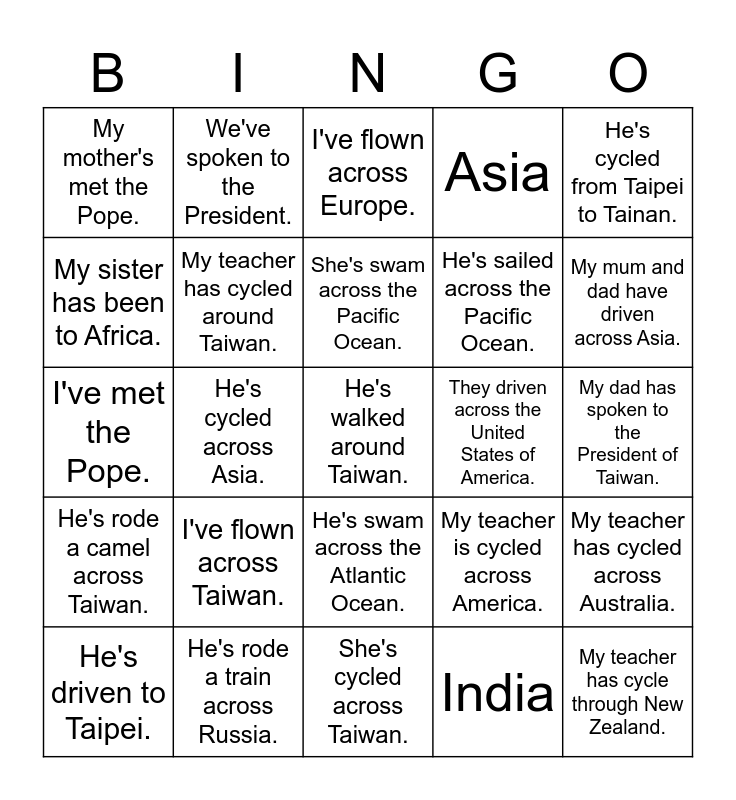 This bingo card has 25 words: I've flown across Taiwan., She's cycled across Taiwan., She's swam across the Pacific Ocean., He's driven to Taipei., He's cycled from Taipei to Tainan., My mother's met the Pope., My sister has been to Africa., We've spoken to the President., They driven across the United States of America., He's swam across the Atlantic Ocean., He's sailed across the Pacific Ocean., I've met the Pope., My teacher is cycled across America., My teacher has cycled across Australia., My teacher has cycled around Taiwan., My teacher has cycle through New Zealand., My dad has spoken to the President of Taiwan., I've flown across Europe., My mum and dad have driven across Asia., He's cycled across Asia., He's walked around Taiwan., He's rode a train across Russia., He's rode a camel across Taiwan., Asia and India.