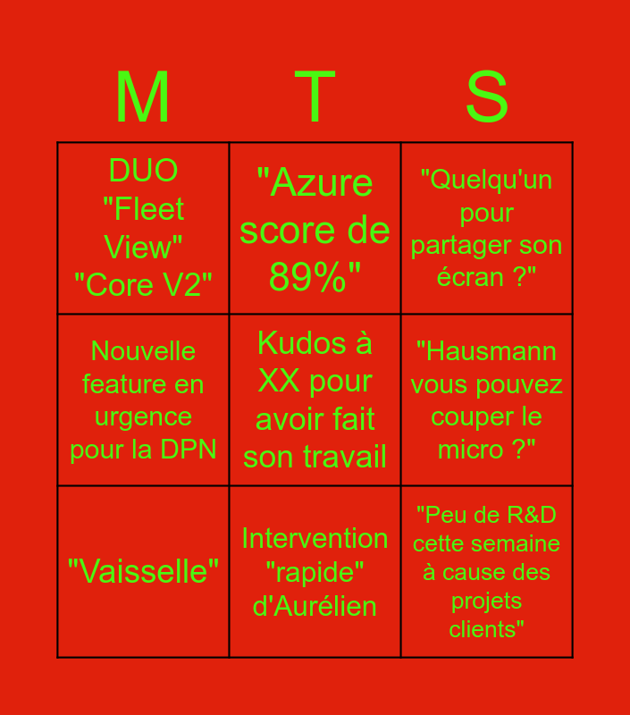 This bingo card has a free space and 8 words: "Hausmann vous pouvez couper le micro ?", "Quelqu'un pour partager son écran ?", "Azure score de 89%", "Vaisselle", DUO "Fleet View" "Core V2", "Peu de R&D cette semaine à cause des projets clients", Nouvelle feature en urgence pour la DPN and Intervention "rapide" d'Aurélien.
