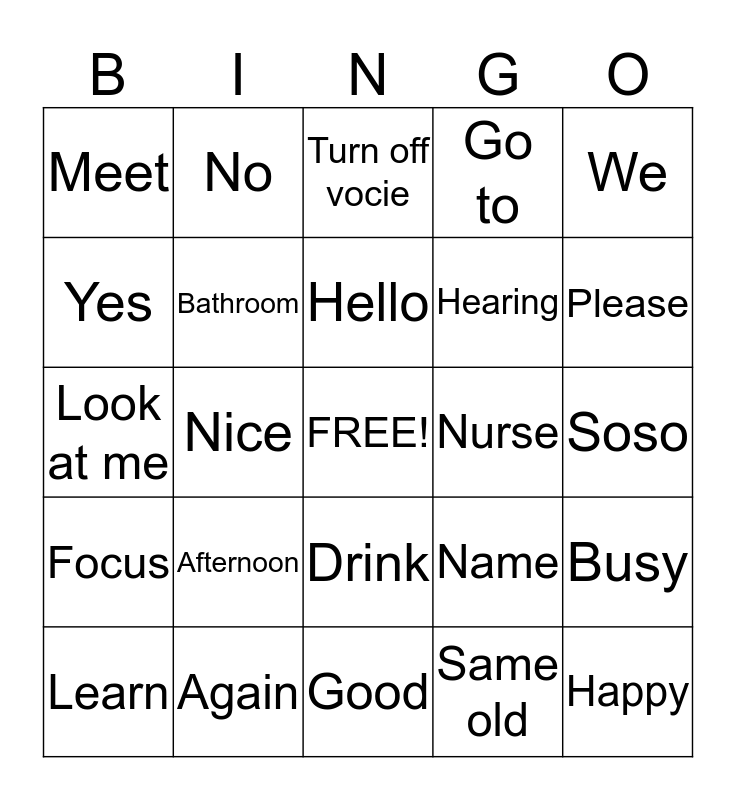 This bingo card has a free space and 24 words: Afternoon, Again, Hello, Learn, We, Meet, Yes, No, Nurse, Drink, Hearing, Look at me, Name, Busy, Bathroom, Same old, Soso, Turn off vocie, Please, Nice, Happy, Focus, Go to and Good.