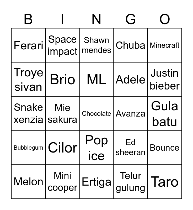 This bingo card has a free space and 24 words: Cilor, Mini cooper, ML, Melon, Minecraft, Ferari, Troye sivan, Space impact, Avanza, Pop ice, Adele, Snake xenzia, Ed sheeran, Bounce, Brio, Telur gulung, Gula batu, Shawn mendes, Justin bieber, Mie sakura, Taro, Bubblegum, Chuba and Ertiga.