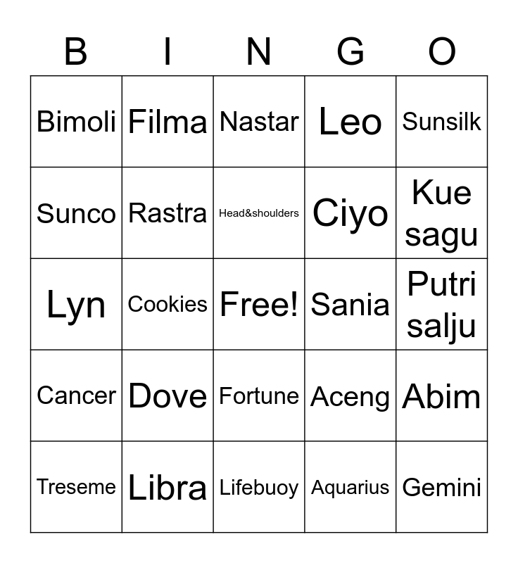 This bingo card has a free space and 25 words: Dove, Lifebuoy, Head&shoulders, Treseme, Sunsilk, Bimoli, Sunco, Filma, Sania, Fortune, Ciyo, Lyn, Aceng, Abim, Rastra, Kastengel, Putri salju, Nastar, Kue sagu, Cookies, Gemini, Libra, Cancer, Leo and Aquarius.