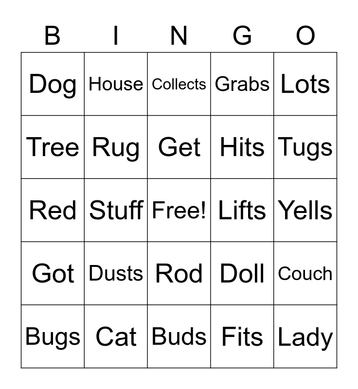 This bingo card has a free space and 24 words: Dusts, Cat, Get, Bugs, Lots, Dog, Tree, House, Lifts, Rod, Hits, Red, Doll, Couch, Rug, Fits, Yells, Collects, Tugs, Stuff, Lady, Got, Grabs and Buds.