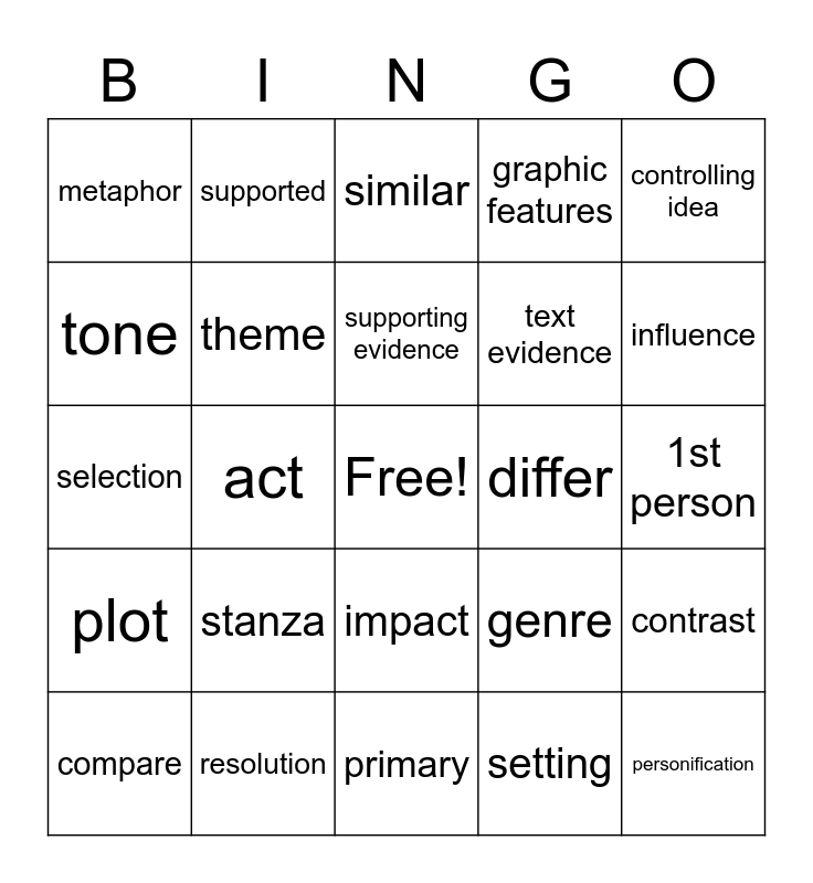 This bingo card has a free space and 60 words: conflict, resolution, point of view, plot, setting, context clues, theme, author’s purpose, text evidence, character development, graphic features, mood, tone, figurative language, simile, metaphor, personification, controlling idea, claim, supporting evidence, differ, similar, compare, contrast, illustrate, infer, emphasize, summary, influence, excerpt, stanza, organizational structure, selection, values, supported, poet, stage directions, act, scenes, selection, rhyme scheme, stanza, 1st person, 3rd person, genre, main idea, dialogue, synonym, antonym, impact, primary, contribute, imagery, objective, reinforce, clarify, characterization, traits, rhythm and conclude.
