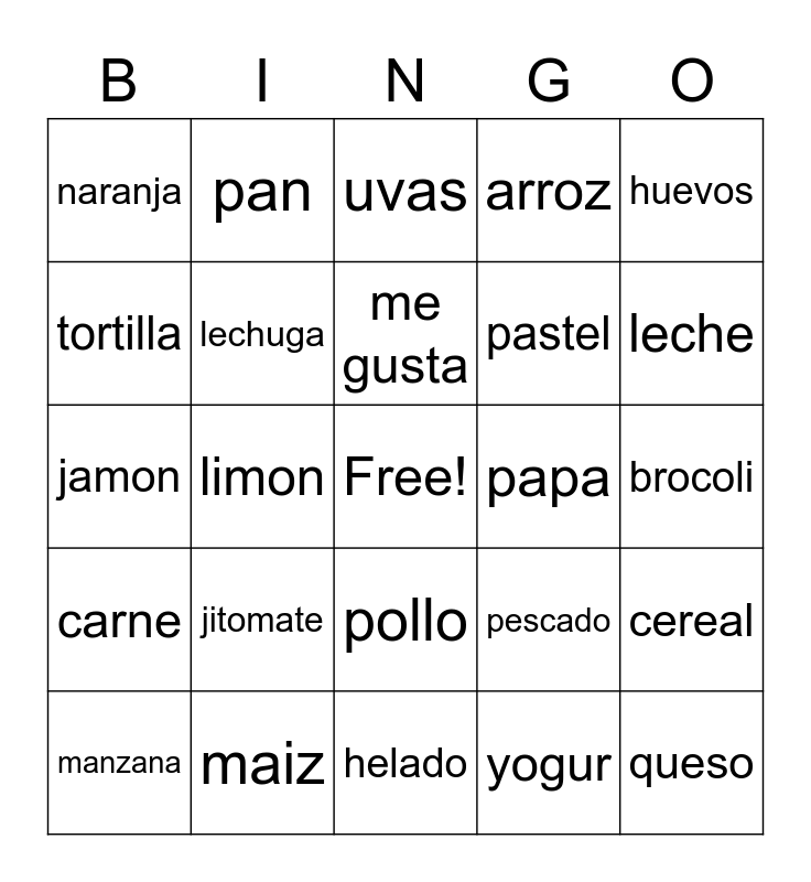 This bingo card has a free space and 29 words: manzana, platano, limon, fresa, naranja, uvas, lechuga, jitomate, papa, maiz, brocoli, queso, helado, yogur, leche, mantequilla, pollo, carne, huevos, jamon, pescado, galleta, pastel, tortilla, arroz, pan, cereal, me gusta and te gusta.