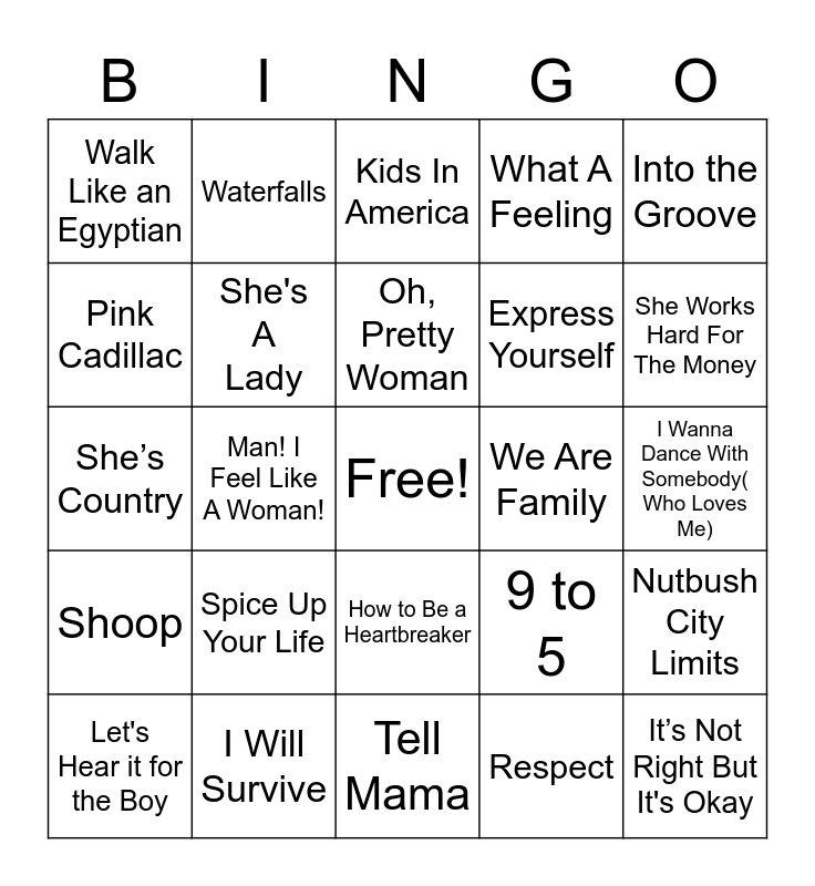This bingo card has a free space and 69 words: Emotions, I Wanna Dance With Somebody( Who Loves Me), It's Raining Men, Single Ladies (Put a Ring on It ), I Will Survive, The Shoop Shoop Song ( Its In His Kiss), What A Feeling, La Isla Bonita, Into the Groove, Disco Inferno, Nutbush City Limits, Barracuda, Walk Like an Egyptian, Kids In America, Stronger ( What Doesn't Kill You), Man! I Feel Like A Woman!, How to Be a Heartbreaker, Express Yourself, Hit Me With Your Best Shot, Shoop, We Are Family, 9 to 5, She Works Hard For The Money, I'm Every Woman, Ain’t Nobody, I'm So Excited, Hot Stuff, New Attitude, Respect, The Loco - Motion, Waterfalls, You Can’t Hurry Love, Venus, So Emotional, Last Chance, Tell It to My Heart, Straight Up, Groove Is in the Heart, Pink Cadillac, Lady Marmalade, Spice Up Your Life, It’s Not Right But It's Okay, Opposites Attract, Walking on Broken Glass, Finally, Let's Hear it for the Boy, I Feel the Earth Move, Girl On Fire, Mamma Mia, She's A Lady, Oh, Pretty Woman, September, Sweet Caroline, Tell Mama, You Are the Best Thing, The Tide Is High, Neutron Dance, Free Your Mind, I’m A Survivor, She’s Country, Stacy’s Mom, Got to Be Real, Hungry Like the Wolf, I’m The Only One, Walking On Sunshine, You Keep Me Hanging On, Before He Cheats, Uptown Girl and Girls Just Want To Have Fun.