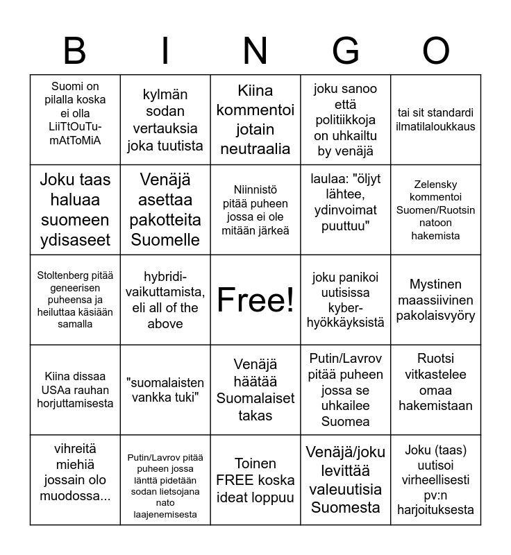 This bingo card has a free space and 24 words: "suomalaisten vankka tuki", Putin/Lavrov pitää puheen jossa länttä pidetään sodan lietsojana nato laajenemisesta, Niinnistö pitää puheen jossa ei ole mitään järkeä, vihreitä miehiä jossain olo muodossa..., tai sit standardi ilmatilaloukkaus, Suomi on pilalla koska ei olla LiiTtOuTu-mAtToMiA, Joku taas haluaa suomeen ydisaseet, kylmän sodan vertauksia joka tuutista, joku panikoi uutisissa kyber-hyökkäyksistä, Venäjä häätää Suomalaiset takas, laulaa: "öljyt lähtee, ydinvoimat puuttuu", Stoltenberg pitää geneerisen puheensa ja heiluttaa käsiään samalla, Putin/Lavrov pitää puheen jossa se uhkailee Suomea, Ruotsi vitkastelee omaa hakemistaan, Venäjä asettaa pakotteita Suomelle, Venäjä/joku levittää valeuutisia Suomesta, Mystinen maassiivinen pakolaisvyöry, Kiina kommentoi jotain neutraalia, Zelensky kommentoi Suomen/Ruotsin natoon hakemista, hybridi-vaikuttamista, eli all of the above, Joku (taas) uutisoi virheellisesti pv:n harjoituksesta, Kiina dissaa USAa rauhan horjuttamisesta, joku sanoo että politiikkoja on uhkailtu by venäjä and Toinen FREE koska ideat loppuu.