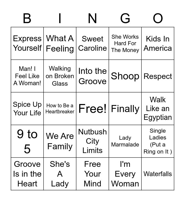 This bingo card has a free space and 67 words: Emotions, I Wanna Dance With Somebody( Who Loves Me), It's Raining Men, Single Ladies (Put a Ring on It ), I Will Survive, The Shoop Shoop Song ( Its In His Kiss), What A Feeling, La Isla Bonita, Into the Groove, Disco Inferno, Nutbush City Limits, Barracuda, Walk Like an Egyptian, Kids In America, Stronger ( What Doesn't Kill You), Man! I Feel Like A Woman!, How to Be a Heartbreaker, Express Yourself, Hit Me With Your Best Shot, Shoop, We Are Family, 9 to 5, She Works Hard For The Money, I'm Every Woman, Ain’t Nobody, I'm So Excited, Hot Stuff, New Attitude, Respect, The Loco - Motion, Waterfalls, You Can’t Hurry Love, Last Chance, Tell It to My Heart, Straight Up, Groove Is in the Heart, Pink Cadillac, Lady Marmalade, Spice Up Your Life, It’s Not Right But It's Okay, Opposites Attract, Walking on Broken Glass, Finally, Let's Hear it for the Boy, I Feel the Earth Move, Girl On Fire, Mamma Mia, She's A Lady, Oh, Pretty Woman, September, Sweet Caroline, Tell Mama, You Are the Best Thing, The Tide Is High, Neutron Dance, Free Your Mind, I’m A Survivor, She’s Country, Stacy’s Mom, Got to Be Real, Hungry Like the Wolf, I’m The Only One, Walking On Sunshine, You Keep Me Hanging On, Before He Cheats, Uptown Girl and Girls Just Want To Have Fun.