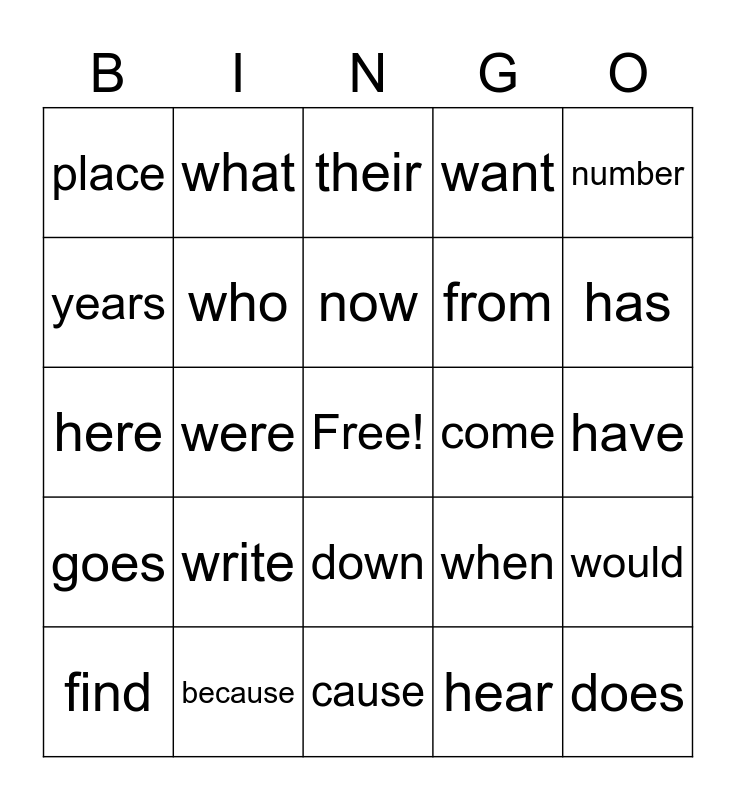 This bingo card has a free space and 24 words: write, because, now, find, number, place, years, what, come, down, from, here, when, would, who, hear, have, their, has, were, does, goes, want and cause.