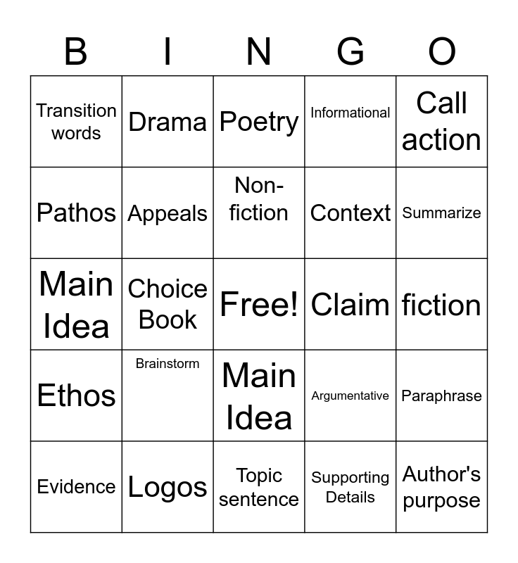 This bingo card has a free space and 24 words: Brainstorm, Logos, Non-fiction, Evidence, Call action, Transition words, Pathos, Drama, Claim, Main Idea, Context, Main Idea, Argumentative, Paraphrase, Appeals, Supporting Details, fiction, Poetry, Summarize, Choice Book, Author's purpose, Ethos, Informational and Topic sentence.
