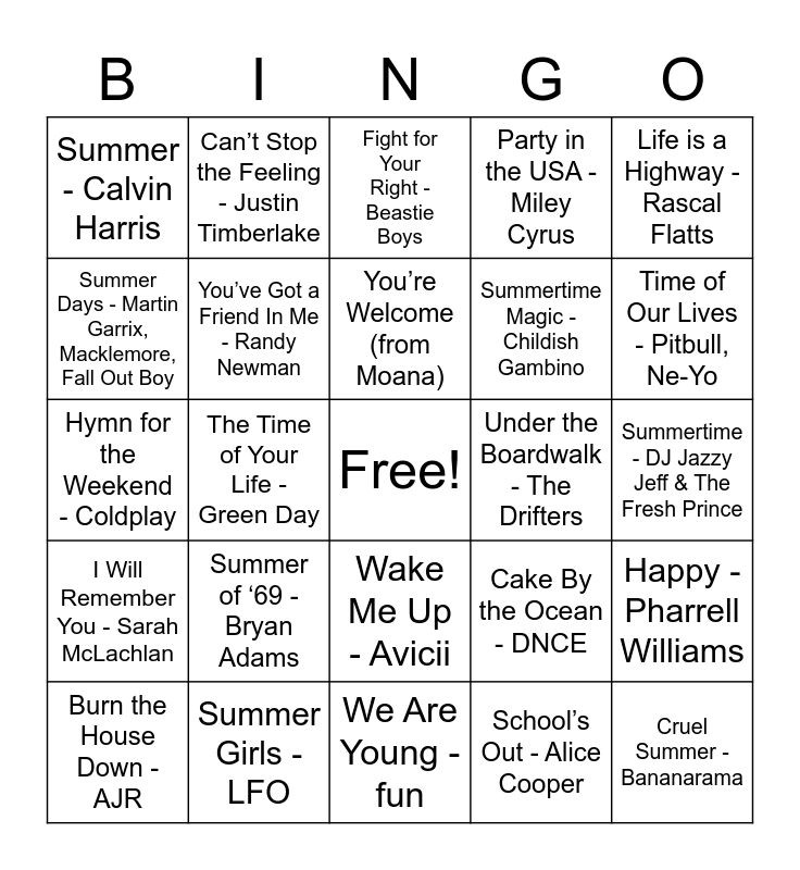 This bingo card has a free space and 32 words: School’s Out - Alice Cooper, I Gotta Feeling - The Black Eyed Peas, The Time of Your Life - Green Day, Best Day of My Life - American Authors, I Will Remember You - Sarah McLachlan, You’ve Got a Friend In Me - Randy Newman, Life is a Highway - Rascal Flatts, Happy - Pharrell Williams, Can’t Stop the Feeling - Justin Timberlake, Thank You For Being a Friend (Golden Girls Theme), You’re Welcome (from Moana), Fight for Your Right - Beastie Boys, Another Brick in the Wall - Beastie Boys, Toes - Zac Brown Band, Under the Boardwalk - The Drifters, Margaritaville - Jimmy Buffett, Burn the House Down - AJR, Hymn for the Weekend - Coldplay, Wake Me Up - Avicii, Summer of ‘69 - Bryan Adams, Cake By the Ocean - DNCE, Vacation - The Go-Go’s, Summertime - DJ Jazzy Jeff & The Fresh Prince, Summer Girls - LFO, Cruel Summer - Bananarama, Party in the USA - Miley Cyrus, Summertime Magic - Childish Gambino, Summer Days - Martin Garrix, Macklemore, Fall Out Boy, Summer - Calvin Harris, We Are Young - fun, I Lived - One Republic and Time of Our Lives - Pitbull, Ne-Yo.