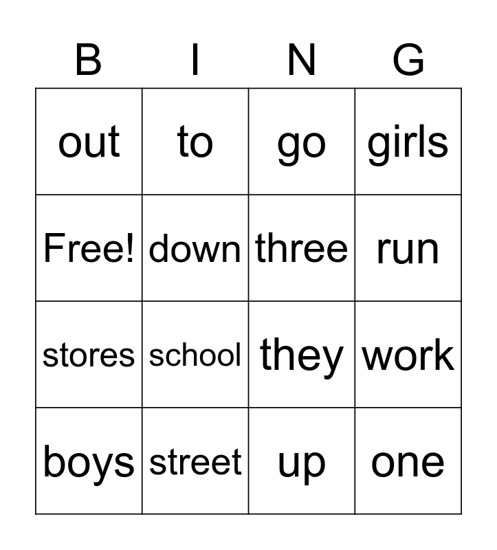 This bingo card has 16 words: street, work, go, out, stores, to, they, up, Free!, down, boys, girls, school, run, three and one.