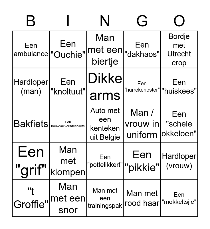 This bingo card has a free space and 24 words: Man met klompen, Man met een snor, Dikke arms, "t Groffie", Bordje met Utrecht erop, Een ambulance, Hardloper (man), Een "Ouchie", Man / vrouw in uniform, Een "pottelikkert", Een "hurrekenester", Bakfiets, Een "pikkie", Hardloper (vrouw), Een "knoltuut", Man met rood haar, Een "schele okkeloen", Man met een biertje, Een "huiskees", Een bouwvakkersdecollete, Een "mokkeltsjie", Een "grif", Een "dakhaos" and Man met een trainingspak.