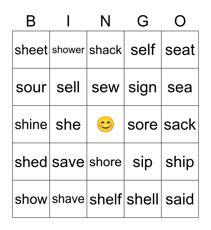This bingo card has a free space and 24 words: save, shave, sew, show, seat, sheet, sour, shower, sore, shore, sign, shine, sip, ship, sell, shell, sack, shack, sea, she, said, shed, self and shelf.