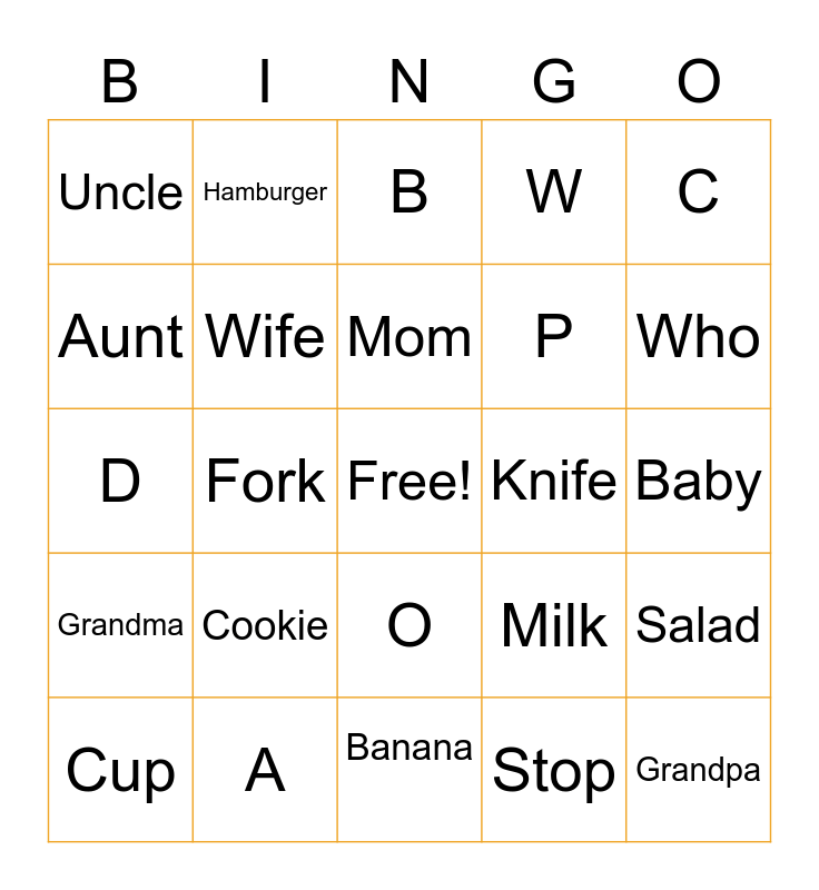 This bingo card has a free space and 24 words: Cookie, A, Mom, Cup, C, Uncle, Aunt, Hamburger, Knife, O, P, D, Milk, Salad, Wife, Stop, Baby, B, Who, Fork, Grandpa, Grandma, W and Banana.