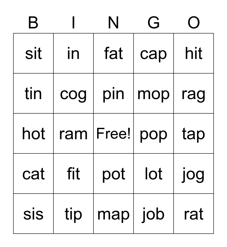 This bingo card has a free space and 24 words: fit, tip, pin, sis, hit, sit, tin, in, pop, pot, mop, hot, lot, jog, cog, job, tap, fat, rag, ram, rat, cat, cap and map.