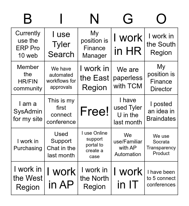 This bingo card has a free space and 25 words: Used Support Chat in the last month, I work in the North Region, I work in the East Region, I work in the West Region, I work in the South Region, Currently use the ERP Pro 10 web, Member the HR/FIN community, I use Tyler Search, I have used Tyler U in the last month, I use Online support portal to create a case, We are paperless with TCM, I am a SysAdmin for my site, We use/Familiar with AP Automation, We use Socrata Transparency Product, We have automated workflows for approvals, We went paperless with using EFT/ACH payments, I posted an idea in Braindates, My position is Finance Manager, My position is Finance Director, This is my first connect conference, I have been to 5 connect conferences, I work in AP, I work in Purchasing, I work in HR and I work in IT.