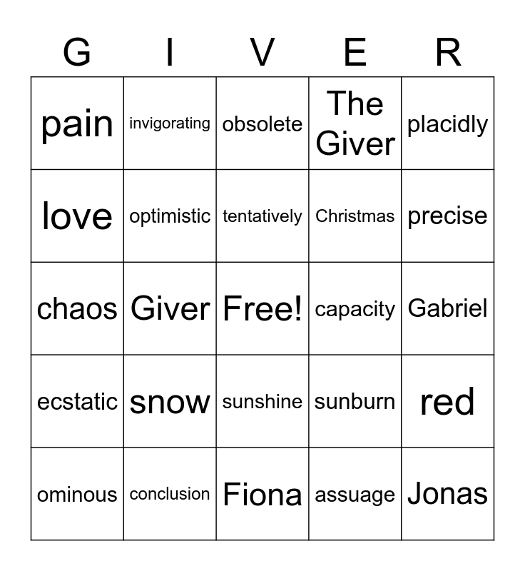 This bingo card has a free space and 34 words: frigid, assuage, excruciating, contorted, ecstatic, optimistic, placidly, ominous, invigorating, torrent, tentatively, obsolete, perceive, admonition, capacity, precise, conclusion, chaos, snow, sunburn, sunshine, color, pain, Gabriel, Fiona, Jonas, The Giver, Asher, Christmas, love, Receiver, Giver, red and light.