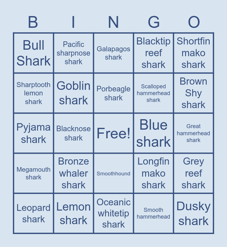 This bingo card has a free space and 36 words: Basking shark, Bigeye thresher shark, Crocodile shark, Goblin shark, Longfin mako shark, Megamouth shark, Porbeagle shark, Salmon shark, Shortfin mako shark, White shark, Blacknose shark, Blacktip reef shark, Blacktip Shark, Blue shark, Brown Shy shark, Bull Shark, Caribbean Reef Shark, Bronze whaler shark, Dusky shark, Galapagos shark, Great hammerhead shark, Grey reef shark, Lemon shark, Leopard shark, Oceanic whitetip shark, Pacific sharpnose shark, Pyjama shark, Sand tiger shark, Scalloped hammerhead shark, Sharptooth lemon shark, Silky shark, Silvertip shark, Smooth hammerhead, Smoothhound, Spinner shark and Tiger shark.