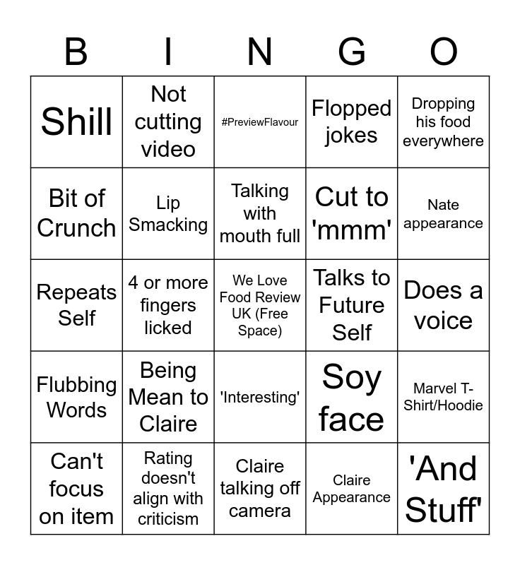This bingo card has a free space and 28 words: Marvel T-Shirt/Hoodie, 'Very noun-y' / 'strong noun flavour', Cut to 'mmm', Claire Appearance, Bit of Crunch, #PreviewFlavour, Not cutting video, Flubbing Words, Talks to Future Self, Can't focus on item, Repeats Self, Flopped jokes, Rating doesn't align with criticism, Claire talking off camera, Nate appearance, Championing A Returnal, Being Mean to Claire, Lip Smacking, Talking with mouth full, 'Interesting', Shill, Remove's ingredient from food, 'And Stuff', 4 or more fingers licked, Does a voice, Soy face, Dropping his food everywhere and 3x Really.