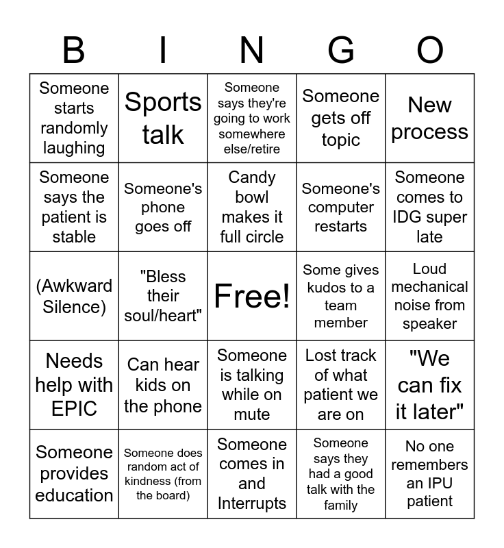 This bingo card has a free space and 29 words: Someone provides education, Someone tells a joke, "Bless their soul/heart", Someone says something inspiring, Someone starts randomly laughing, Someone says they're going to work somewhere else/retire, Someone's phone goes off, Can hear kids on the phone, Some gives kudos to a team member, Someone does random act of kindness (from the board), Loud mechanical noise from speaker, No one remembers an IPU patient, Someone comes in and Interrupts, Someone says they had a good talk with the family, Someone comes to IDG super late, Everyone's email goes off, Someone is talking while on mute, Needs help with EPIC, New process, (Awkward Silence), Lost track of what patient we are on, "They're so cute/nice", Someone's computer restarts, Someone says the patient is stable, Someone gets off topic, Sports talk, "We can fix it later", Candy bowl makes it full circle and Someone starts singing.
