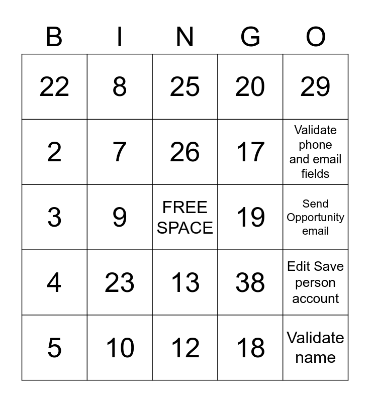 This bingo card has a free space and 34 words: 1, 6, 11, 16, Send Opportunity email, 2, 7, 12, 17, Validate name, 3, 8, 18, Validate bill to and ship to, 4, 9, 13, 19, Edit Save person account, 5, 10, 14, 20, Validate phone and email fields, 21, 23, 25, 27, 29, 22, 24, 26, 38 and 30.