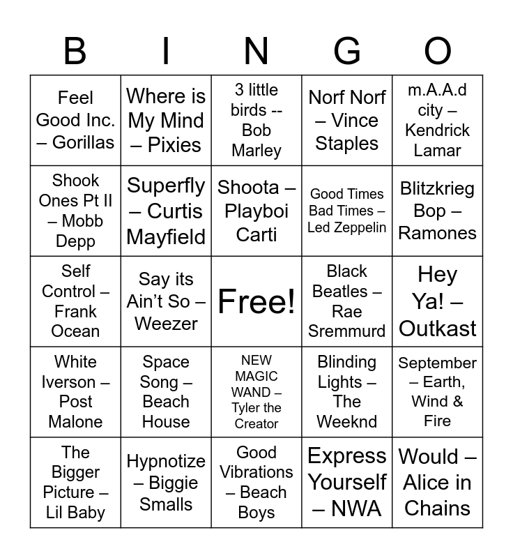 This bingo card has a free space and 98 words: Billy Jean – Michael Jackson, Paper Planes – M.I.A., Sabotage – Beastie Boys, Hey Ya! – Outkast, Dancing Queen – ABBA, What’s Going On – Marvin Gaye, Heart Shaped Box – Nirvana, Superstition – Stevie Wonder, NY State of Mind – Nas, Doo Wop (That Thing) – Lauryn Hill, Dreams – Fleetwood Mac, Baba O’Riley – The Who, It Was A Good Day – Ice Cube, Space Song – Beach House, Kids – MGMT, Where is My Mind – Pixies, Self Control – Frank Ocean, Ghost Town – Kanye West, Don’t Dream It’s Over – Crowded House, Respect – Aretha Franklin, Tongue Tied – Group Love, Dancing in the Dark – Bruce Springsteen, Don’t Stop me now – Queen, Sk8er Boi – Avril Lavigne, Heart of Glass – Blondie, Feel Good Inc. – Gorillas, Good Vibrations – Beach Boys, Toxic – Brittney Spears, Take on me – AHA, Space Oddity – David Bowie, The Bigger Picture – Lil Baby, Shook Ones Pt II – Mobb Depp, Black Hole Sun – Soundgarden, Jump Around – House of Pain, Blitzkrieg Bop – Ramones, Here Comes Your Man – Pixies, Norf Norf – Vince Staples, 90210 – Travis Scott, Say its Ain’t So – Weezer, No Role Modelz – J Cole, Pyramids – Frank Ocean, Shoota – Playboi Carti, Good Times Bad Times – Led Zeppelin, Uncontrollable Urge – Devo, C.R.E.A.M – Wutang Clan, NEW MAGIC WAND – Tyler the Creator, Paranoid – Black Sabbath, Just Like Heaven – The Cure, Rosa Parks – Outkast, King Kunta – Kendrick Lamar, ALL CAPS – MF DOOM, Dark Fantasy – Kanye West, Future – March Madness, Money Trees – Kendrick Lamar, Forever – Charli XCX, Cigarette Daydreams – Cage the Elephant, White Iverson – Post Malone, Motion Sickness – Phoebe Bridgers, Love on the Brain – Rihanna, Irreplaceable – Beyonce, Lucy In the Sky with Diamonds – The Beatles, Maps – Yeah Yeah Yeahs, Don’t Start Now – Dua Lipa, Good 4 U – Olivia Rodrigo, thank u, next – Ariana Grande, Lover – Taylor Swift, Creep – Radiohead, Money – Pink Floyd, Say so – Doja Cat, Once in a lifetime – Talking Heads, 3 little birds -- Bob Marley, Sittin on the Dock of the bay – Otis Reading, Express Yourself – NWA, Float on – Modest Mouse, Everybody Wants to Rule the World – Tears for Fears, Run Away With Me – Carly Rae Jepsen, Hold On, We’re Going Home – Drake, Dior – Pop Smoke, Makes No Sense – YoungBoy Never Broke Again, Would – Alice in Chains, Keep Ya Head Up – 2pac, Superfly – Curtis Mayfield, Hypnotize – Biggie Smalls, Love Will Tear Us Apart – Joy Division, Gimme Shelter – Rolling Stones, Ballroom Blitz – Sweet, Leave the Door Open – Silk Sonic (Bruno Mars & Anderson .Paak), Should I Stay or Should I Go, September – Earth, Wind & Fire, Redbone – Childish Gambino, Love Galore – SZA, Blinding Lights – The Weeknd, Thinkin Bout You – Frank Ocean, Caroline – Amine, Black Beatles – Rae Sremmurd, Broccoli – Dram, Lil Yachty, m.A.A.d city – Kendrick Lamar and Mr. Rager – Kid Cudi.