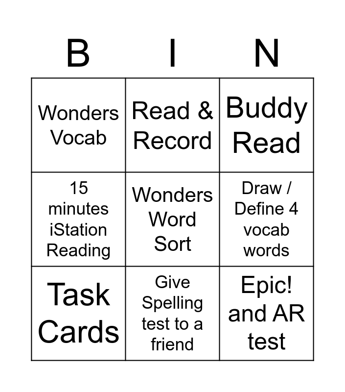 This bingo card has 12 words: Rainbow Write Spelling, Epic! and AR test, Wonders Word Sort, Draw / Define 4 vocab words, Read & Record, Buddy Read, Give Spelling test to a friend, ReadWorks on Google Classroom, Wonders Vocab, 15 minutes iStation Reading, Task Cards and Dictionary Search for 5 spelling words & definitions.