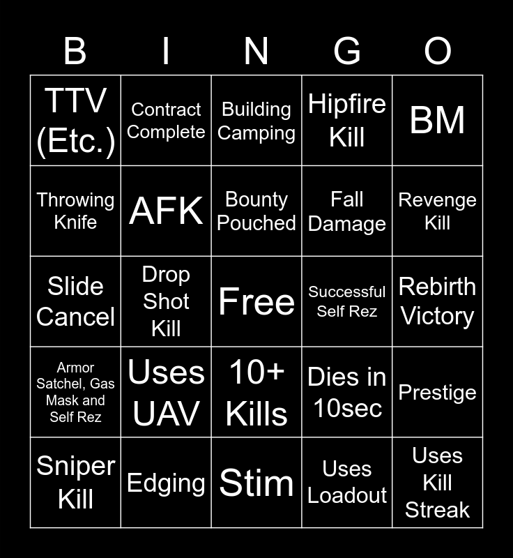 This bingo card has a free space and 24 words: Uses UAV, Edging, Bounty Pouched, Sniper Kill, BM, TTV (Etc.), Throwing Knife, Contract Complete, Successful Self Rez, 10+ Kills, Fall Damage, Slide Cancel, Dies in 10sec, Prestige, AFK, Uses Loadout, Rebirth Victory, Building Camping, Revenge Kill, Drop Shot Kill, Uses Kill Streak, Armor Satchel, Gas Mask and Self Rez, Hipfire Kill and Stim.