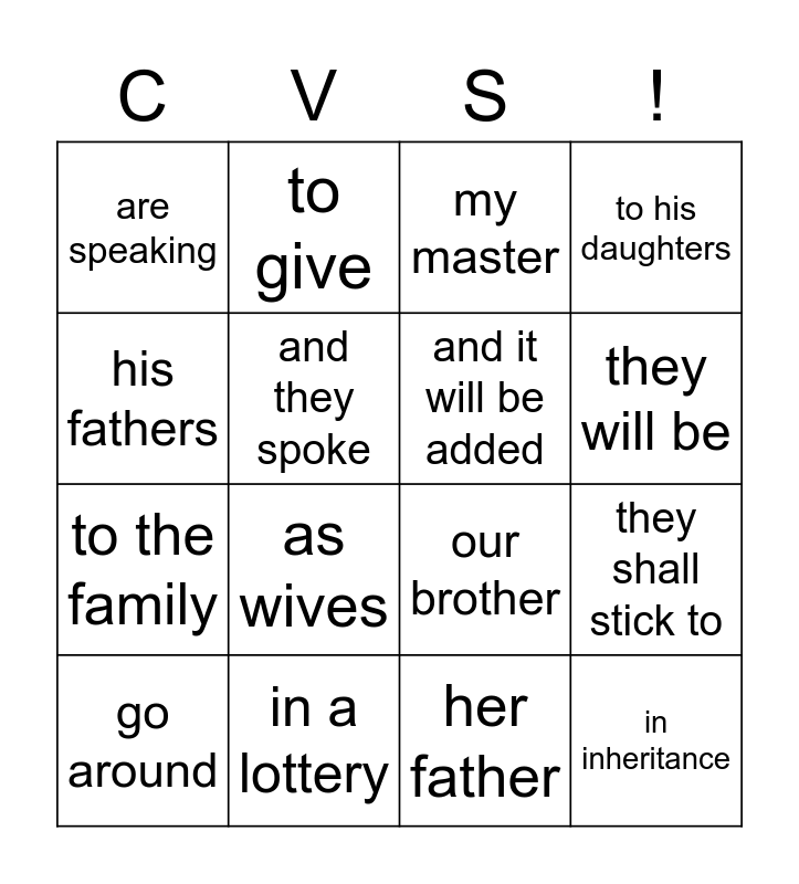 This bingo card has 28 words: and they came near, the heads of, to the family, from the families, and they spoke, my master, to give, in inheritance, in a lottery, the inheritance of, our brother, to his daughters, and they will be, the tribes of, as wives, their inheritance, from the inheritance, and it will be added, they will be, our inheritance, are speaking, in their eyes, go around, they shall stick to, her father, in order, his fathers and and they were.