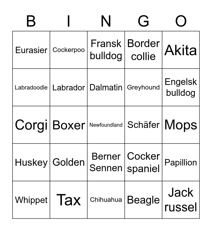 This bingo card has a free space and 24 words: Golden, Tax, Dalmatin, Whippet, Akita, Eurasier, Labradoodle, Cockerpoo, Schäfer, Berner Sennen, Greyhound, Corgi, Cocker spaniel, Papillion, Labrador, Beagle, Mops, Fransk bulldog, Engelsk bulldog, Boxer, Jack russel, Huskey, Border collie and Chihuahua.