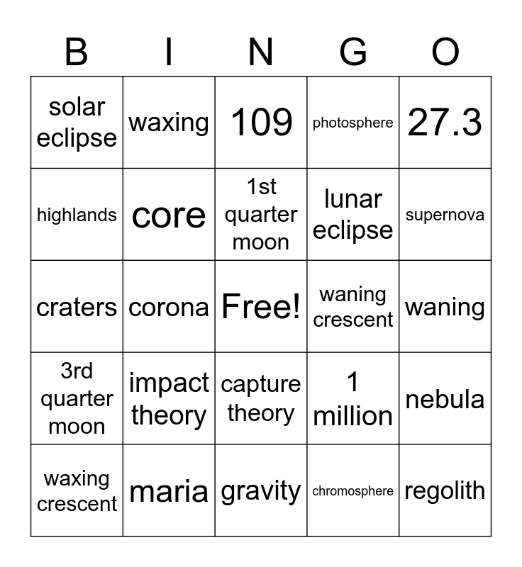 This bingo card has a free space and 24 words: impact theory, maria, 1st quarter moon, waxing crescent, 27.3, solar eclipse, highlands, waxing, waning crescent, capture theory, lunar eclipse, craters, 1 million, nebula, core, chromosphere, waning, 109, supernova, corona, regolith, 3rd quarter moon, photosphere and gravity.