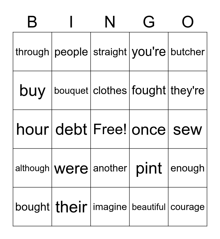 This bingo card has a free space and 24 words: were, their, clothes, bought, butcher, through, buy, people, once, another, fought, hour, pint, enough, bouquet, beautiful, sew, straight, they're, debt, courage, although, you're and imagine.