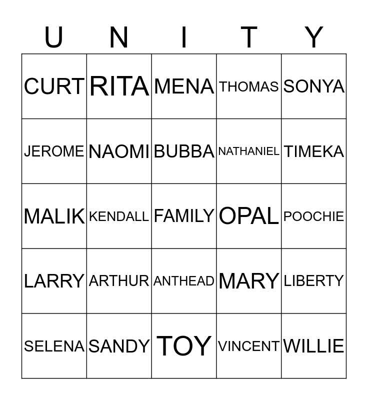 This bingo card has a free space and 45 words: THERESA, WILLIE, YVETTE, SELENA, MARION, VINCENT, MENA, CHARLES, SONYA, SANDY, THOMAS, OPAL, ANTHEAD, ARTHUR, LINDA, TOY, JOI, MALIK, JAMICKA, TIMEKA, RITA, DAMION, NIKKI, CURT, KENNEDY, POOCHIE, TONYA, NEE-NEE, MARY, LARRY, PETE, LIBERTY, NANA CAKE, CEDRIC, JEREMIAH, KENDALL, FRANK, LILLIE, DORETHA, BUBBA, JEROME, NATHANIEL, SANDRA, NAOMI and TY.