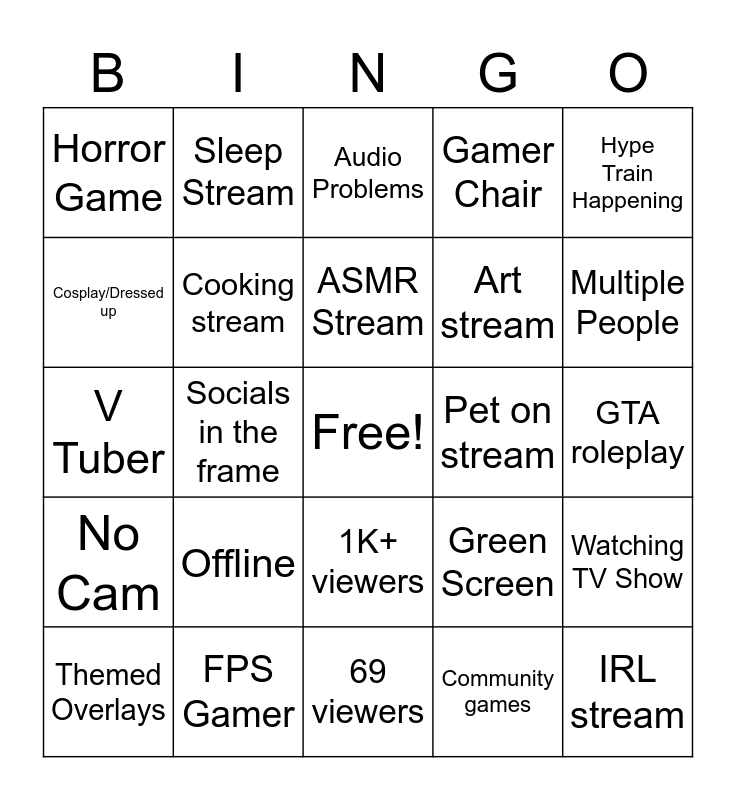 This bingo card has a free space and 24 words: Offline, FPS Gamer, ASMR Stream, Themed Overlays, Hype Train Happening, Horror Game, Cosplay/Dressed up, Sleep Stream, Pet on stream, 1K+ viewers, Art stream, V Tuber, Green Screen, Watching TV Show, Cooking stream, Community games, GTA roleplay, Audio Problems, Multiple People, Socials in the frame, IRL stream, No Cam, Gamer Chair and 69 viewers.
