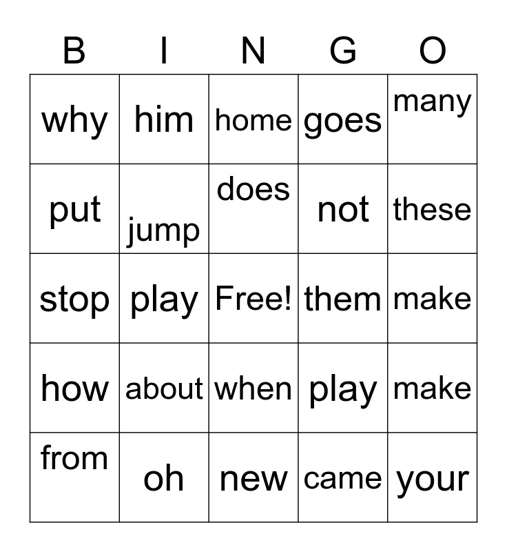 This bingo card has a free space and 24 words: about, oh, does, from, many, why, put, him, them, when, not, stop, play, make, jump, came, make, home, these, play, your, how, goes and new.