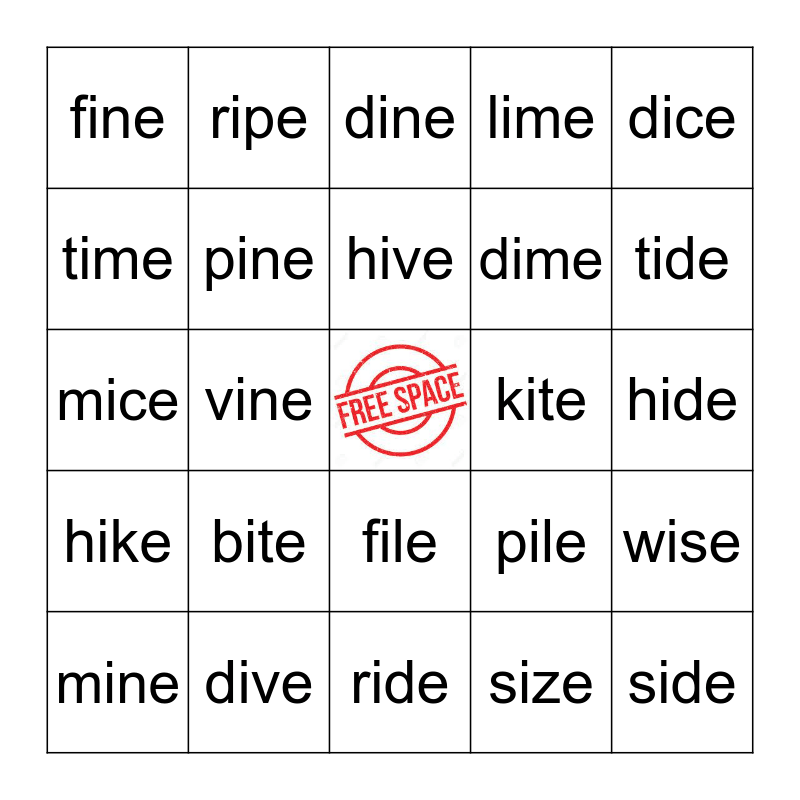 This bingo card has a free space and 29 words: mine, nine, vine, line, fine, dine, pine, bite, kite, dive, hide, side, ride, size, tide, bike, file, hike, dice, mice, pile, wife, dime, time, lime, ripe, wise, hive and five.