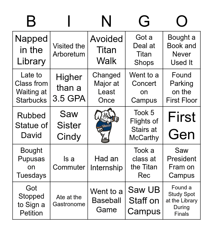 This bingo card has a free space and 24 words: Is a Commuter, Ate at the Gastronome, Changed Major at Least Once, Got Stopped to Sign a Petition, Bought a Book and Never Used It, Napped in the Library, Late to Class from Waiting at Starbucks, Visited the Arboretum, Took 5 Flights of Stairs at McCarthy, Had an Internship, Went to a Concert on Campus, Rubbed Statue of David, Took a class at the Titan Rec, Saw President Fram on Campus, Higher than a 3.5 GPA, Saw UB Staff on Campus, First Gen, Avoided Titan Walk, Found Parking on the First Floor, Saw Sister Cindy, Found a Study Spot at the Library During Finals, Bought Pupusas on Tuesdays, Got a Deal at Titan Shops and Went to a Baseball Game.