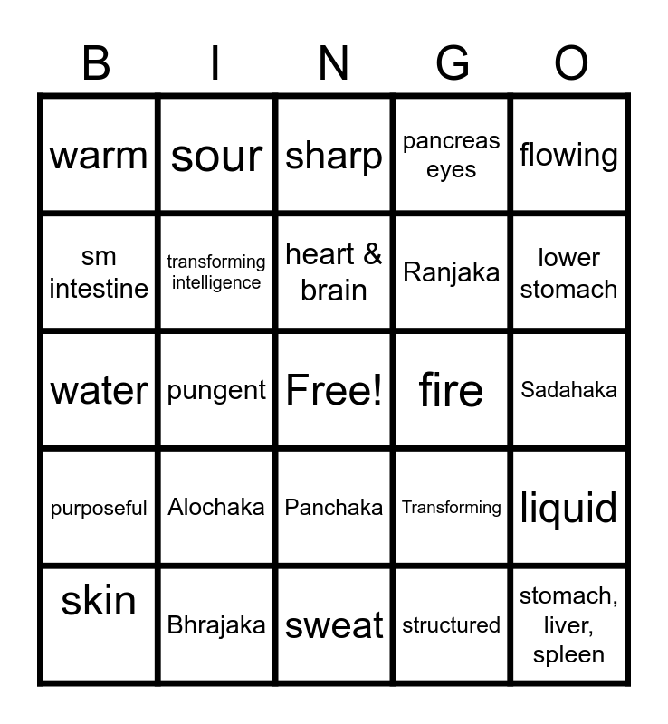 This bingo card has a free space and 24 words: Alochaka, Bhrajaka, heart & brain, skin, flowing, warm, sm intestine, sour, fire, Panchaka, Ranjaka, water, Transforming, liquid, transforming intelligence, structured, Sadahaka, sharp, lower stomach, pungent, stomach, liver, spleen, purposeful, pancreas eyes and sweat.