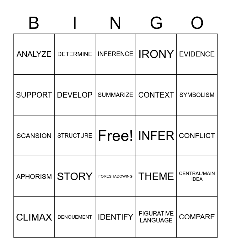 This bingo card has a free space and 52 words: TEXT, COMPARE, DESCRIBE, IDENTIFY, STORY, DEMONSTRATE, DETERMINE, EXPLAIN, SUPPORT, DETAILS, DEVELOP, NARRATIVE, CENTRAL/MAIN IDEA, THEME, EXPLICIT, INFER, SUMMARIZE, INFER, SUMMARIZE, EVIDENCE, STRUCTURE, FIGURATIVE LANGUAGE, ANALYZE, CONTEXT, CITE, EVALUATE, ASSESS, ARGUMENT, SYMBOLISM, METONYMY, RHYTHM, IRONY, CHATACTERIZATION, ALLUSION, PERSONIFICATION, INFERENCE, DENOUEMENT, ASIDE, ALLITERATION, PARADOX, IMAGERY, CONFLICT, APHORISM, ALLEGORY, FORESHADOWING, COMEDY, ANECDOTE, SCANSION, METAPHOR, EUPHEMISIM, CLIMAX and ANALOGUE.