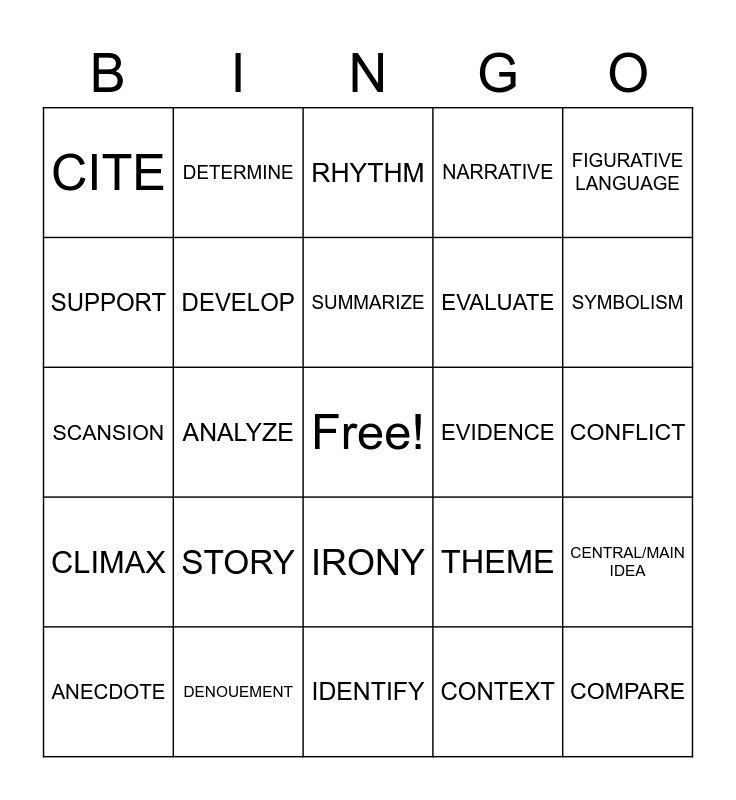 This bingo card has a free space and 50 words: TEXT, COMPARE, DESCRIBE, IDENTIFY, STORY, DEMONSTRATE, DETERMINE, EXPLAIN, SUPPORT, DETAILS, DEVELOP, NARRATIVE, CENTRAL/MAIN IDEA, THEME, EXPLICIT, INFER, SUMMARIZE, EVIDENCE, STRUCTURE, FIGURATIVE LANGUAGE, ANALYZE, CONTEXT, CITE, EVALUATE, ASSESS, ARGUMENT, SYMBOLISM, METONYMY, RHYTHM, IRONY, CHATACTERIZATION, ALLUSION, PERSONIFICATION, INFERENCE, DENOUEMENT, ASIDE, ALLITERATION, PARADOX, IMAGERY, CONFLICT, APHORISM, ALLEGORY, FORESHADOWING, COMEDY, ANECDOTE, SCANSION, METAPHOR, EUPHEMISIM, CLIMAX and ANALOGUE.