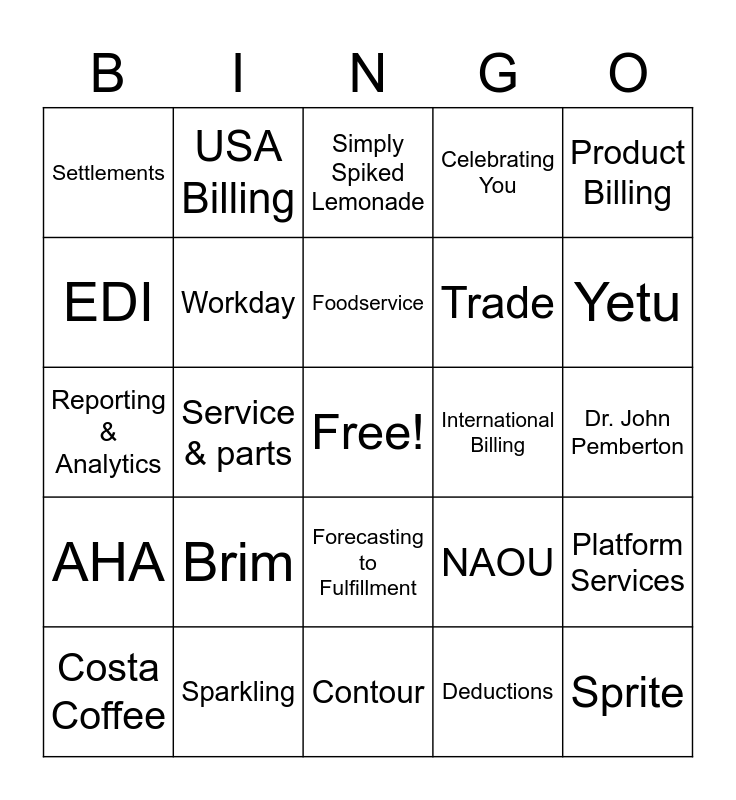 This bingo card has a free space and 51 words: Coca Cola, Sprite, Simply, Contour, Brim, MM Legacy, USA Billing, Concentrate, EDI, Master Data, Workday, Celebrating You, Platform Services, NAOU, Pricing, Bottler, Foodservice, International Billing, Non-Product Billing, Product Billing, Service & parts, Deductions, Settlements, Trade, Freight, AOC, Yetu, Horizons, Costa Coffee, Simply Spiked Lemonade, Topo Chico, Body Armor, Accounts Receivable, Tax, Hydration, Sparkling, Fairlife, Gold Peak, Minute Maid, Networked Organization, Dr. John Pemberton, AHA, Smartwater, Fresca, Genpact, Credit Risk, Reporting & Analytics, Revenue Recognition, Billing Helpdesk, Forecasting to Fulfillment and Delivering Value.