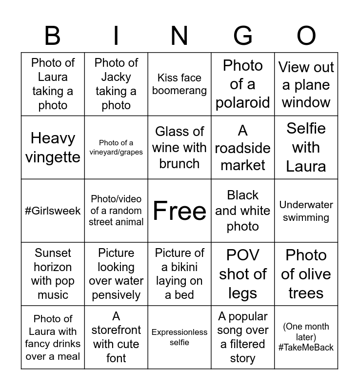 This bingo card has a free space and 24 words: Picture looking over water pensively, A storefront with cute font, Glass of wine with brunch, Photo of Laura with fancy drinks over a meal, View out a plane window, Photo of Laura taking a photo, Heavy vingette, Photo of Jacky taking a photo, Black and white photo, Picture of a bikini laying on a bed, A roadside market, #Girlsweek, POV shot of legs, Photo of olive trees, Photo of a vineyard/grapes, A popular song over a filtered story, Underwater swimming, Kiss face boomerang, Selfie with Laura, Photo/video of a random street animal, (One month later) #TakeMeBack, Sunset horizon with pop music, Photo of a polaroid and Expressionless selfie.