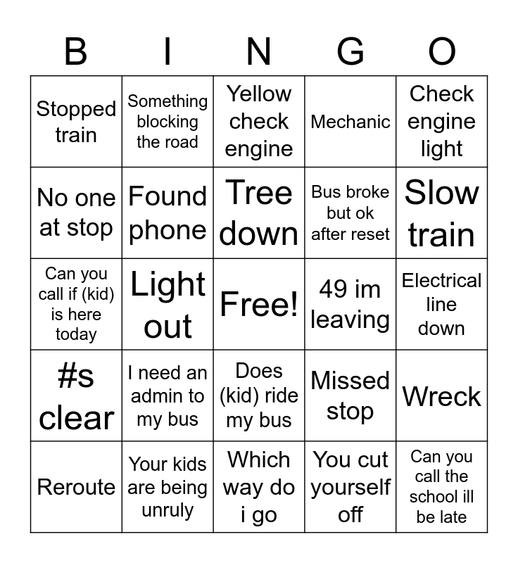 This bingo card has a free space and 46 words: I got your last stop, Can you call the school ill be late, I need police, Which way do i go, I need an admin to my bus, Is the train still there, Something blocking the road, Bus wont shift, No one at stop, Lost phone, Found phone, Mechanic, Wreck, Missed stop, Can you get my stop, Lost air pods, Tree down, 49 im leaving, Check lights, Check engine light, Light out, You cut yourself off, Stopped train, Bus broke but ok after reset, Fast moving train, Slow train, Reroute, Is (kid) on your bus, Does (kid) ride my bus, #s clear, Sick kid, Your bus is smoking, You can get over now, My radio was off did you call me, What does this light mean, Your kids are being unruly, Electrical line down, Power out, Can i still drive it, Flood, I can’t get through, Yellow check engine, Can you call if (kid) is here today, No one here to pickup (kid), Screaming kids in background and Singing kids.
