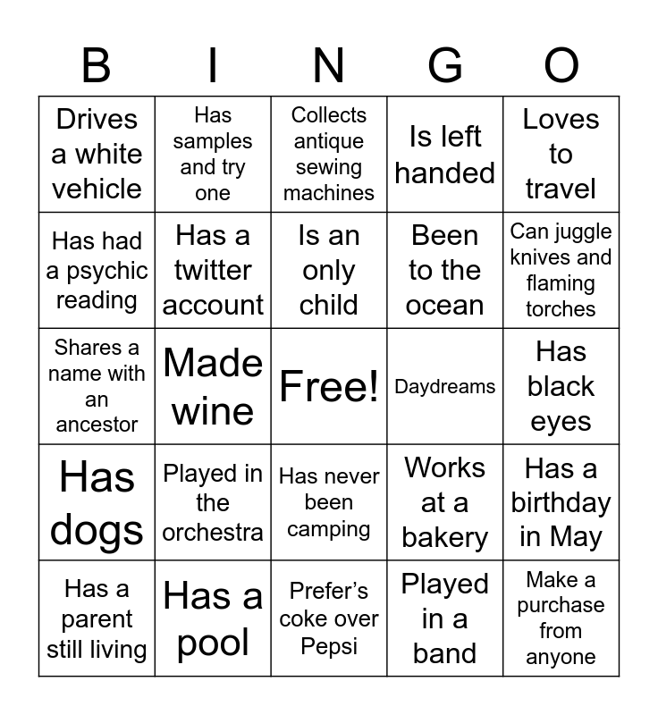 This bingo card has a free space and 97 words: Camped out at Miller Park, Is getting married on July 23, 2022, Shook hands with President Clinton in Kuwait years ago, Made wine, Make a purchase from anyone, Loves to garden, Is obsessed with Star Wars, Loves to play word games, Rescues Cats, Adopted 5 children, Served in the military, Sells Spices, Met Loki (Tom Hiddleston) in 2019, Has dogs, Has cats, Drives a white vehicle, Loves to travel, Has 5 grandchildren, Was part of a clogging team for 15 years, Took a horse and buggy through a Dairy Queen drive thru, Has painted toe nails, Prefers Pepsi over Coke, Likes to sing, Doesn’t have Facebook, Has 3+ Siblings, Is an only child, Has a parent still living, Has a birthday in May, Have never broke a bone, Went to a movie last week, Has a twitter account, Is left handed, Doesn’t have a middle name, Is over 6ft, Prefer’s coke over Pepsi, Has never been camping, Has been on a cruise, Enjoys cooking, Planted a garden this year, Shares a name with an ancestor, Has green eyes, Has black eyes, Has blue eyes, Played in a band, Played in the orchestra, Was prom queen, Served on prom court, Married their high school sweetheart, Has planted a garden last year, Is a Bucks fan, Is a brewers fan, Is is a Packers fan, Enjoys the four seasons of Wisconsin Weather, Enjoys eating out, Loves to bake, Make a purchase from anyone, Ask Tupperware to tell you what their best products are and why, Has samples and try one, Is the youngest of four, Avid Hello Kitty Collector, Loves going to Breezy Hill Campground, Competed in Body Building figure division, Loves Tim Burton, Wears glasses, Enjoys going to the movies, Was on the News, Has fish, Sings in the shower, Eats pizza, Has a pool, Been to the ocean, Swam with Dolphins 🐬, Enjoys bowling, Been married for 30+ years, Has a pet hedgehog 🦔, Can’t function without coffee, Enjoys ice tea, Was born in the Netherlands, Daydreams, Loves to shop, Loves to play volleyball, Can juggle knives and flaming torches, Went on a mission trip to Guatemala, Has a birthday in April, Has a gym membership, Has been in a beauty pageant, Make a purchase from anyone, Has a minivan, Drives a truck, Drives a motorcycle, Collects antique sewing machines, Enjoys shopping at thrift stores, Loves to grill out, Works at a bakery, Has had a psychic reading, Who is the Top Heavyweight Lifter in WI and Serves in the Navy.