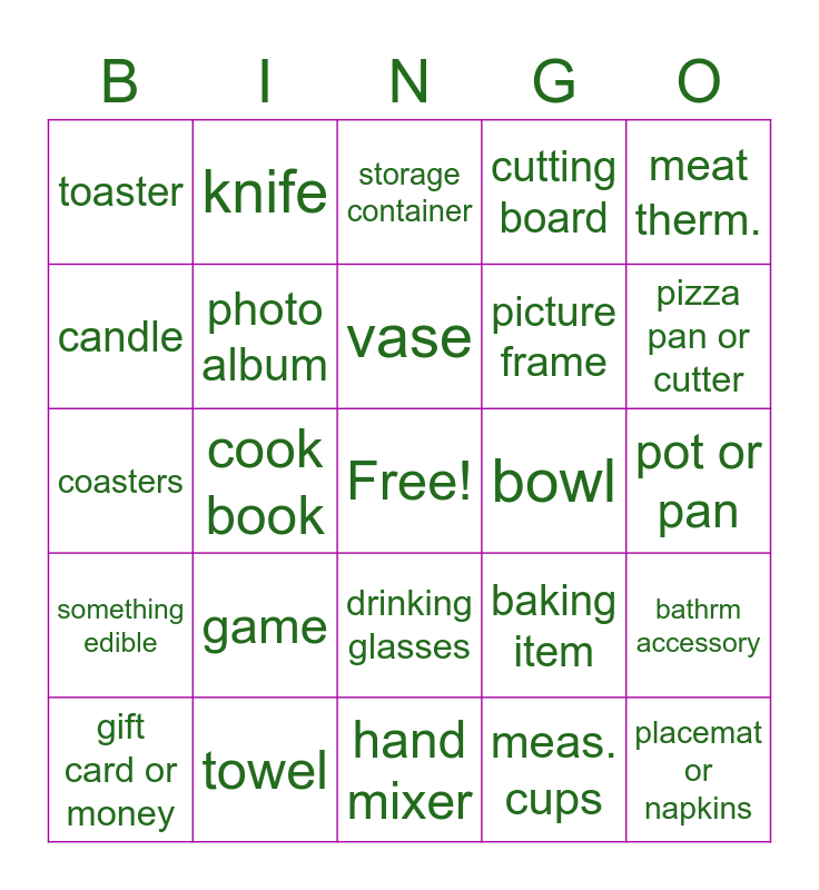 This bingo card has a free space and 29 words: gift card or money, plate, cook book, camping item, toaster, storage container, photo album, game, bowl, towel, pot or pan, placemat or napkins, hand mixer, meas. cups, pizza pan or cutter, kitchen utensil, drinking glasses, something edible, meat therm., coasters, baking item, artwork, picture frame, candle, cutting board, knife, bathrm accessory, vase and blanket or sheets.