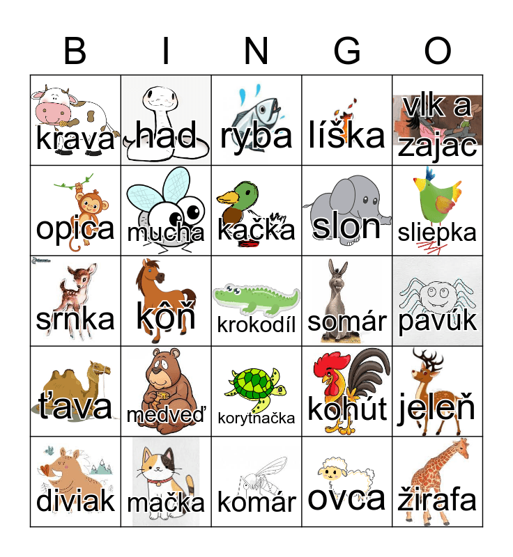 This bingo card has 30 images and 30 words: mačka, pes, kôň, prasa, krava, ryba, mucha, korytnačka, somár, komár, pavúk, krokodíl, ovca, žirafa, sliepka, kura, kohút, ťava, medveď, vlk a zajac, srnka, vtáčik, had, slon, opica, líška, jeleň, diviak, kačka and hus.